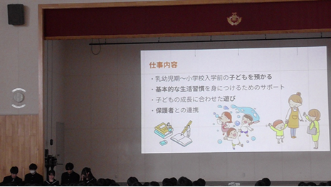 11月4日(火)の5・6時間目に、2年生8グループが1年生や保護者、インターンシップでお世話になった方々に探究の成果を発表しました。どのグループも職業について調べ、八雲町との関連について5分程度にまとめあげていました。本発表会では審査員として、八雲町教育委員会教育長、及び学校運営協議会委員の方々をお招きし、最優秀グループを決定しました。選ばれたグループは、「tan-fest in 渡島・檜山管内」に出場します。