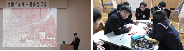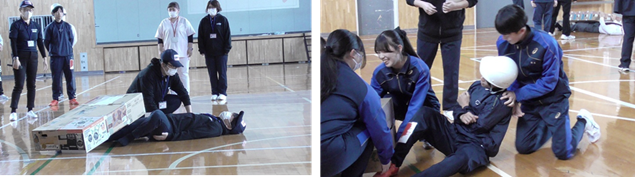 2・3・4時間目は八雲総合病院から、災害派遣チーム【DMAT】の皆様をお招きし、学年ごとにグループワークを行いました。1学年は「災害時の持ち出しアイテムを考えよう」、2学年は「ハザードマップを手がかりに命を守る避難経路を考えよう」、3学年は「災害時の応急処置と搬送を体験しよう」というテーマのもと、災害時の様々な状況下で自分たちにできることを学びました。