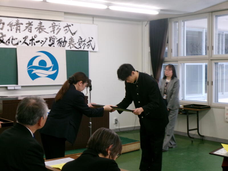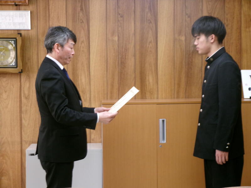 2月24日本校校長室で渡島教育局長 長居 成好 様より表彰状を授与されました。関谷くんは、次年度も頑張りたいという意気込みを語っていました。