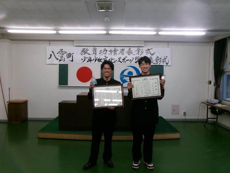 スポーツで全国大会に出場する等の優秀な成績を収めたことが認められ、陸上競技部3年生平田光我さん、2年生関谷悠暉さんが、八雲町少年少女文化・スポーツ奨励賞を受賞しました。