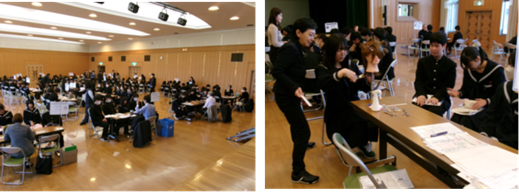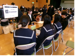 11月5日(水)5・6時間目、シルバープラザふれあいホールにおいて「進路の日」職業学問発見フェアを実施しました。1・2学年を対象に、22校の大学・短期大学・専門学校の方々にお越しいただき、40以上の分野の学問・職業について、体験学習を交えながら説明をしていただきました。生徒は、各校のブースを3クールに分けて周り、それぞれの職業の業務内容や魅力、職に就くまでのルート、また各学問の研究領域や研究内容、将来どのような職業につながるかといった説明を、非常に熱心に聞き入っていました。参加した生徒は、「現在考えている職業の他にも魅力的な職業があることが分かり、進路に対する視野が広がりました」「志望している職業について詳しく聞くことができて、大変参考になりました」と語っていました。職業や学問について具体的に知る貴重な機会となりました。
