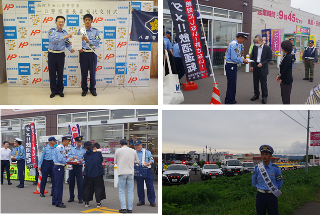 署長室で委嘱状の交付をしていただき、交通安全啓発活動として、マックスバリュ八雲店の入り口に立ち、反射板やLEDライト、ティッシュなど交通安全グッズを配布いたしました。また、国道5号線沿いに立ち、パトライト活動や旗の波活動なども行いました。制服に身を包み、交通安全の呼びかけを行い、多くの方々に笑顔で声をかける姿がとても印象的でした。